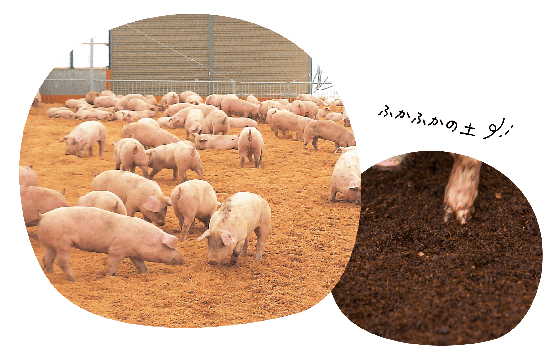 広々とした豚舎の床に敷き詰められているのは、もみ殻やおがくずなどのふかふかな発酵床「バイオベッド」。豚舎では、豚たちがバイオベッドを掘り返したり、元気に駆け回ったりと、いきいきと過ごしています。