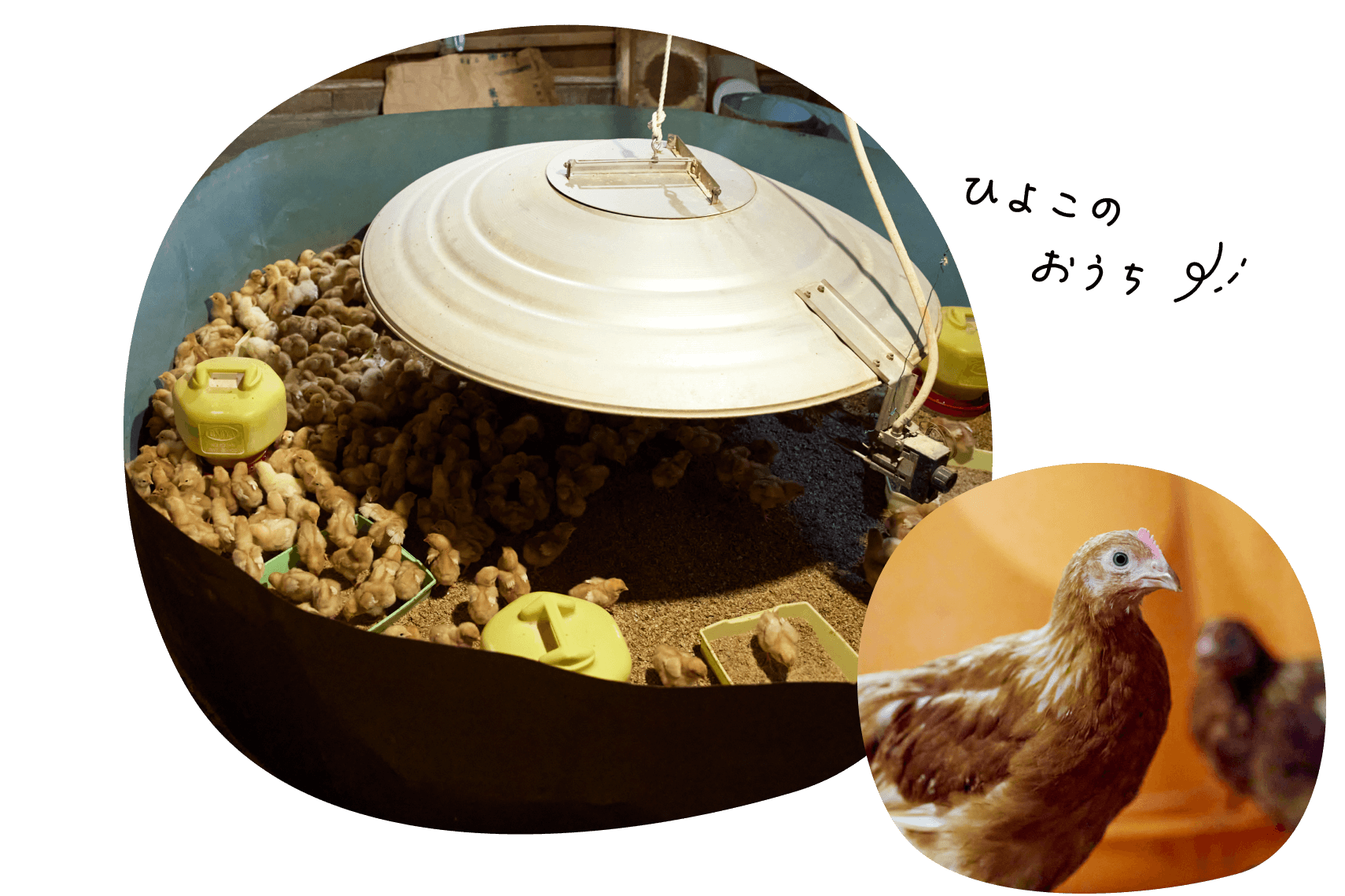 『コア・フード平飼いたまご』の産地のひとつ、有限会社おひさまぽかぽか。のどかな水田に囲まれた農場内の小屋では、ついこの間生まれたばかりのひよこが、ピヨピヨと歩き回っています。