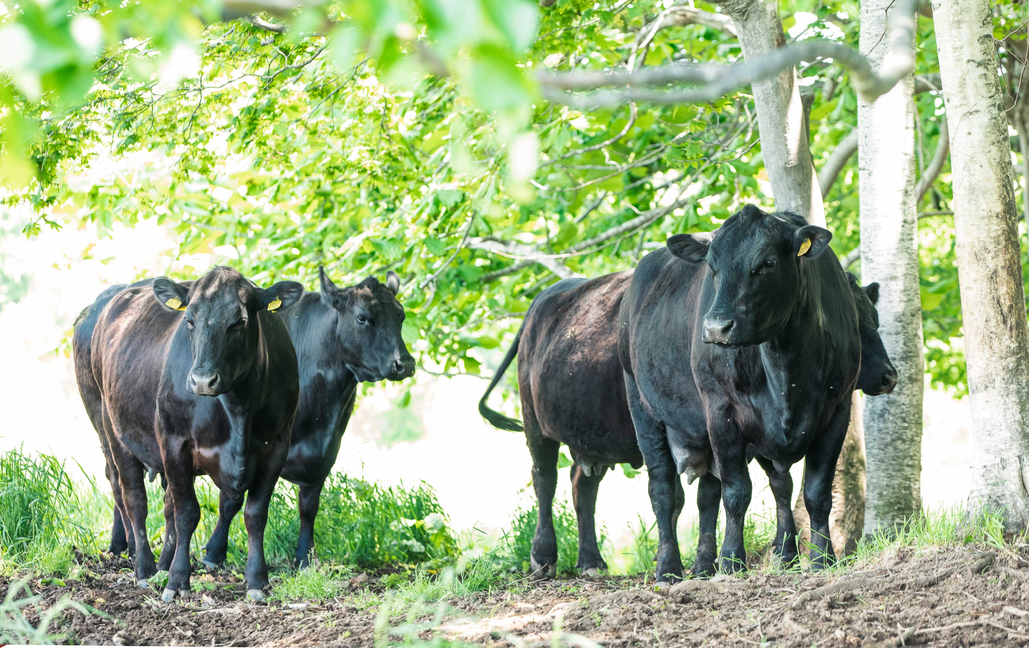 北海道北広島市にある宮北牧場は、半世紀以上にわたりアンガス牛を手がけている、歴史ある牧場です。森に囲まれた広い牧草地では、牛たちがのんびりと草を食んでいます。