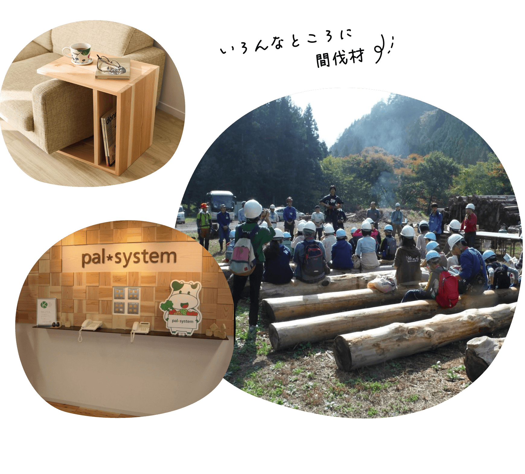パルシステムと産地では、形や見た目がさまざまな間伐材への理解を深めながら、食器や軽家具などの商品開発を行っています。パルシステムのオフィスの内装や、配送トラックの床材として活用する取り組みも。