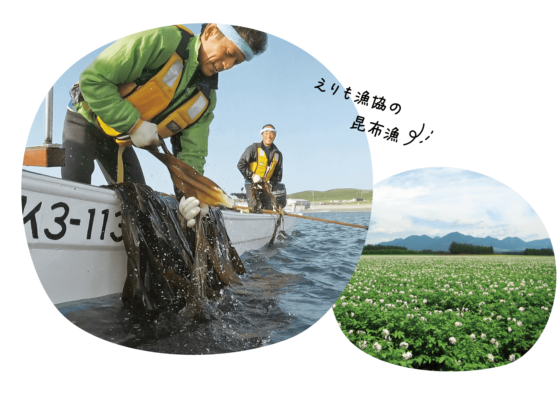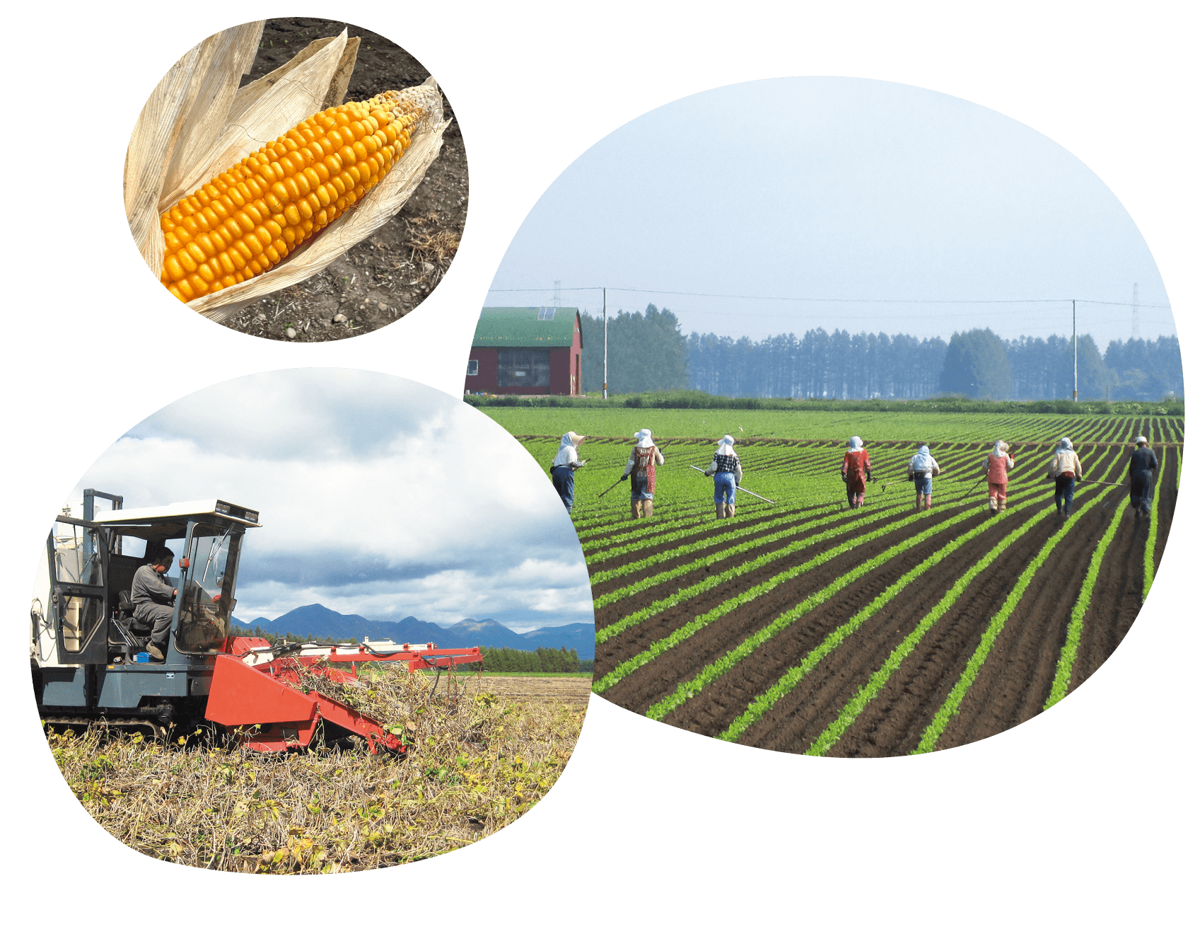 北海道・十勝平野の音更(おとふけ)町で、じゃがいもや小豆、大豆などの作物を育てている大牧農場。道内の各地から届いた北の恵みを、広大な畑の土づくりに生かしています。