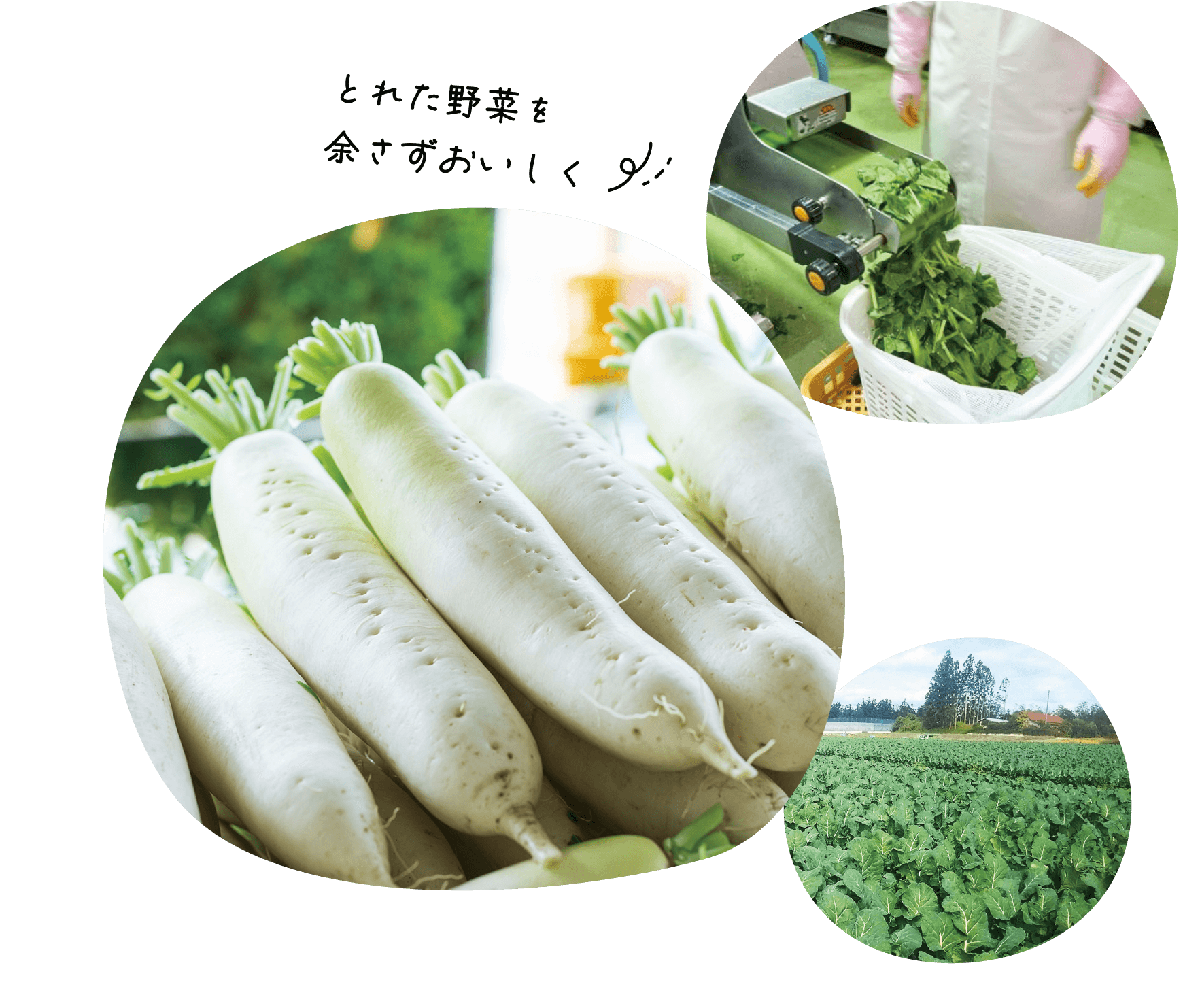 余剰青果を冷凍野菜に。形が悪く出荷ができない規格外の白菜や、病気によって黒くなってしまった一部分を取り除いた大根を漬け物に。これまで廃棄するしかなかった青果が、新たな商品として生まれ変わりました。