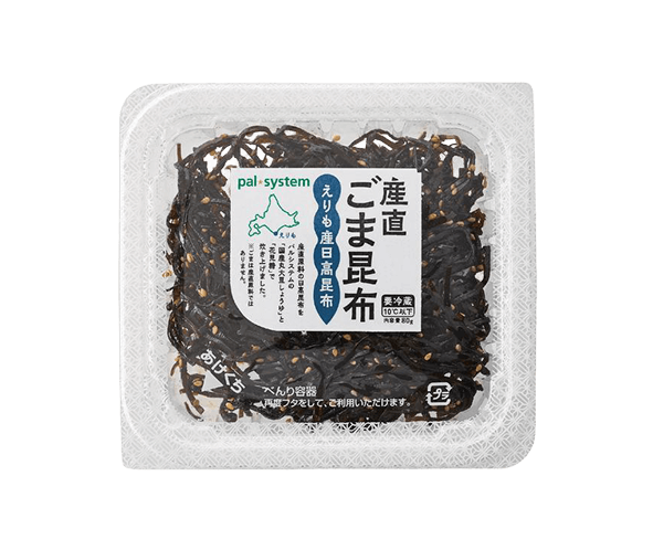 パルシステムのオリジナル商品『産直ごま昆布』。原材料の昆布は、産直産地・えりも漁業協同組合でとれる天然の日高昆布です。パルシステムの『国産丸大豆しょうゆ』と『花見糖』のみで味付けをした、シンプルさが魅力です。